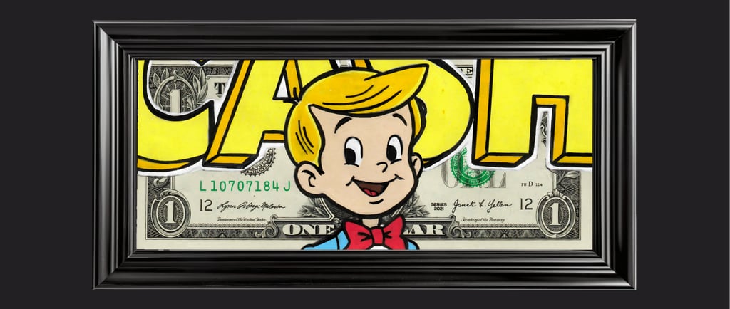 Résumé : Un billet authentique de 1 dollar est revisité avec Richie Rich devant le mot « CASH », évoquant la richesse comme évidence et privilège. Réalisée à la main en technique mixte (acrylique et Posca), l’œuvre détourne la monnaie en récit pop sur le rêve du cash, l’héritage et l’innocence du pouvoir financier.