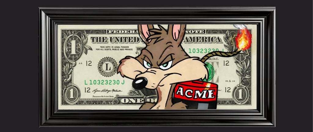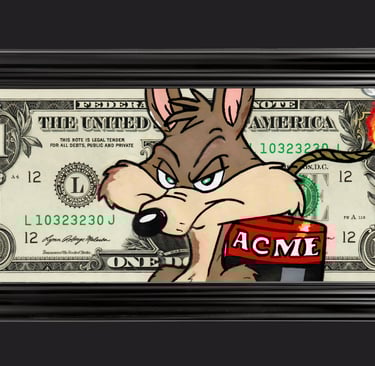 Résumé : Un billet authentique de 1 dollar est détourné avec le Coyote tenant une dynamite allumée, illustrant la tension entre contrôle et explosion. Réalisée à la main en technique mixte (acrylique et Posca), l’œuvre transforme la monnaie en scène de risque et de pression, où l’argent devient un détonateur symbolique.