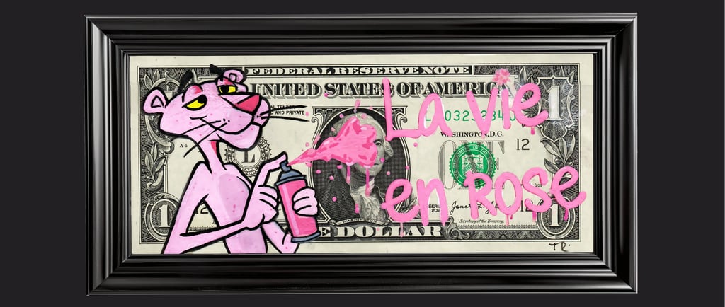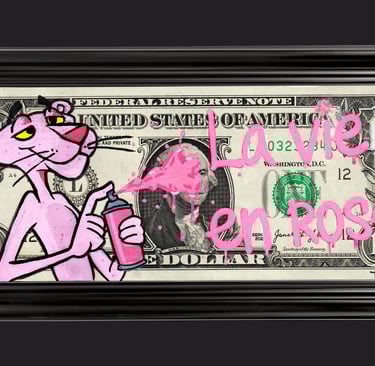 Résumé : Un billet authentique de 1 dollar est revisité avec Pink Panther, icône d’élégance et d’ironie, tenant une bombe de peinture comme pour laisser une déclaration d’amour. Réalisée à la main en technique mixte (acrylique et Posca), l’œuvre transforme la monnaie en surface d’expression poétique où le rose répond à la rigueur du billet. Elle mêle romantisme, humour et critique contemporaine.