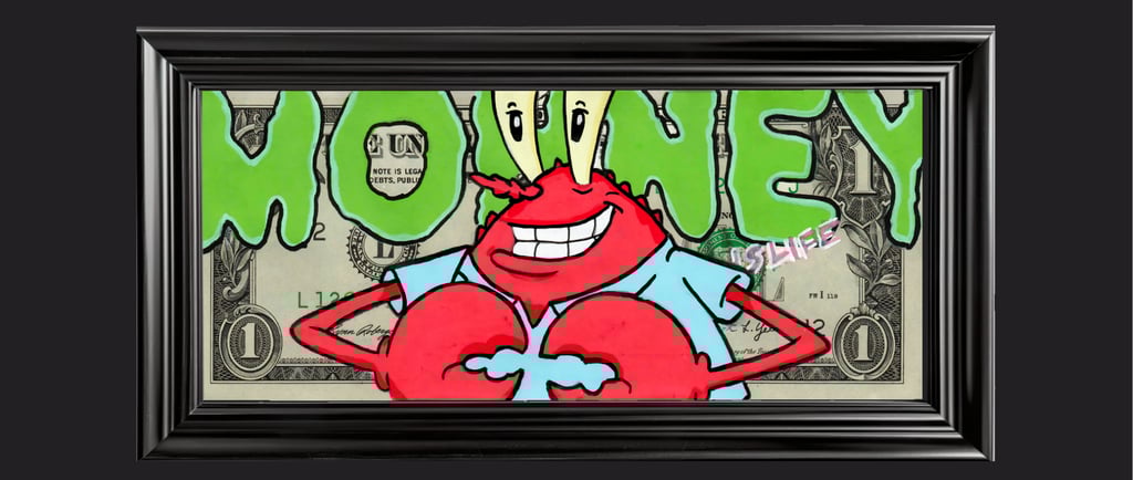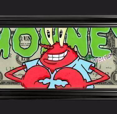Résumé : Un billet authentique de 1 dollar est détourné avec Mr. Krabs et la typographie « MONEY is life », affirmant l’argent comme moteur absolu. Réalisée à la main en technique mixte (acrylique et Posca), l’œuvre transforme le billet en slogan satirique, entre humour et critique du culte moderne de la richesse.