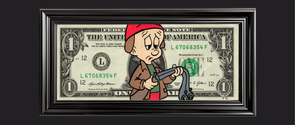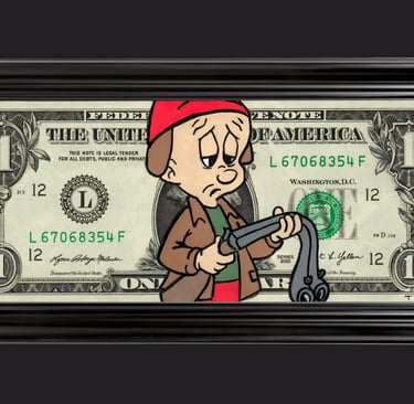 Résumé : Un billet authentique de 1 dollar est détourné avec Elmer Fudd, le chasseur iconique des Looney Tunes, représenté dans une posture fatiguée et mélancolique. Réalisée à la main en technique mixte (acrylique et Posca), l’œuvre transforme la monnaie en satire pop où la chasse devient métaphore de survie et de quête de valeur.
