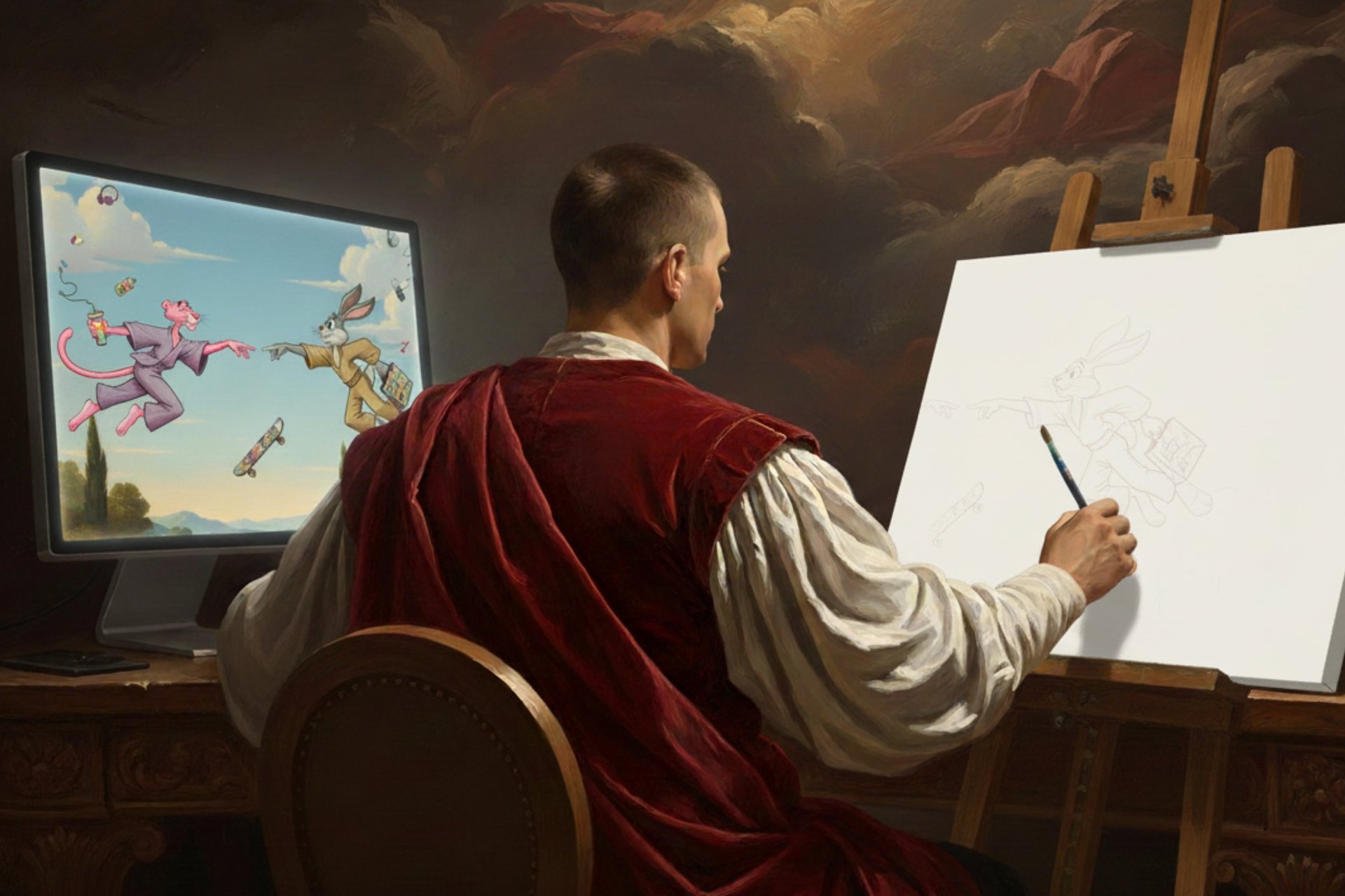 La composition s’appuie sur des principes issus de la Renaissance — équilibre, construction, perspective — tout en intégrant des outils contemporains, du dessin numérique préparatoire à la peinture physique.