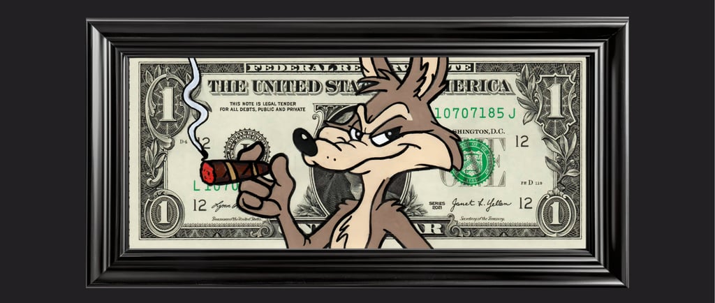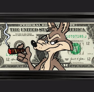 Résumé : Un billet authentique de 1 dollar est réinterprété avec le Coyote, cigare à la main et regard calculateur, incarnant la stratégie et l’ambition. Réalisée à la main en technique mixte (acrylique et Posca), l’œuvre détourne le symbole monétaire en objet de collection où la confiance devient une posture et le pouvoir un jeu d’apparence.