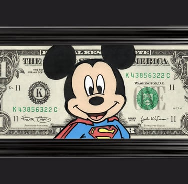 Résumé : Un billet authentique de 1 dollar est détourné avec Mickey en super-héros, cape rouge et emblème sur le torse, incarnant une force positive et protectrice. Réalisée à la main en technique mixte (acrylique et Posca), l’œuvre transforme la monnaie en icône pop où la confiance devient une puissance héroïque.