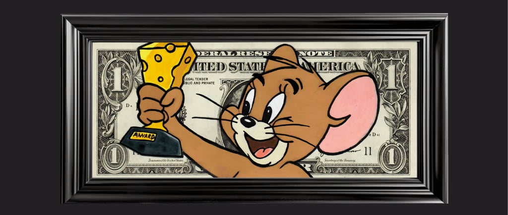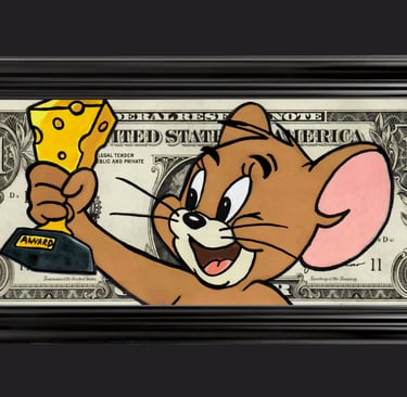 Résumé : Un billet authentique de 1 dollar est réinterprété avec Jerry brandissant un trophée en forme de fromage, symbole d’une victoire joyeuse et personnelle. Réalisée à la main en technique mixte (acrylique et Posca), l’œuvre détourne la monnaie en récompense pop, parlant du succès comme désir et conquête.