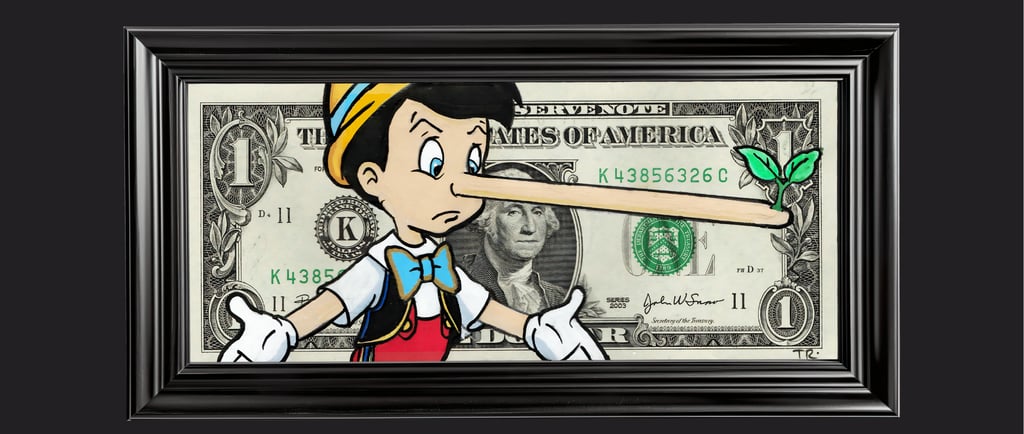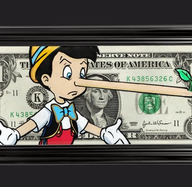 Résumé : Un billet authentique de 1 dollar est réinterprété avec Pinocchio, symbole de vérité et de choix moral. Son nez démesuré, semblant sortir du cadre, matérialise la tension entre mensonge, silence et honnêteté, et ce que la sincérité coûte réellement. Réalisée à la main en technique mixte (acrylique et Posca), l’œuvre transforme le billet en récit sur une vérité fragile, souvent négociée, dans un monde dominé par l’apparence et la valeur.