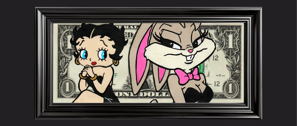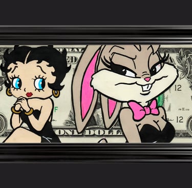 Résumé : Un billet authentique de 1 dollar est réinterprété avec Betty Boop et Lola Bunny, mêlant glamour vintage et assurance moderne dans une mise en scène de séduction. Réalisée à la main en technique mixte (acrylique et Posca), l’œuvre transforme la monnaie en récit où l’image devient pouvoir, entre attraction, contrôle et valeur.