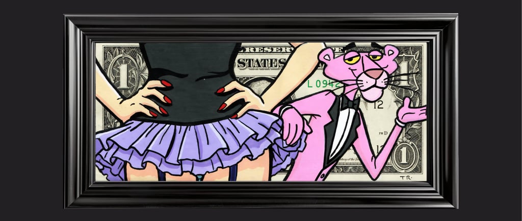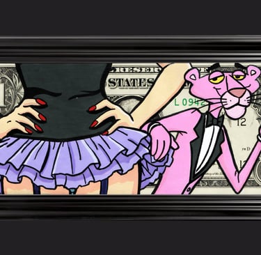 Un billet authentique de 1 dollar détourné avec la Panthère Rose, incarnant une séduction maîtrisée où le pouvoir réside dans l’attitude et le contrôle. Une œuvre pop où la tentation devient un jeu subtil et calculé.