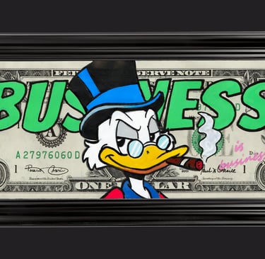 Résumé : Un billet authentique de 1 dollar, marqué « Business is business », est détourné avec Scrooge McDuck (Oncle Picsou) en homme d’affaires confiant, cigare au bec. Réalisée à la main en technique mixte (acrylique et Posca), l’œuvre transforme le symbole monétaire en objet de collection, questionnant le pouvoir et la logique du profit.