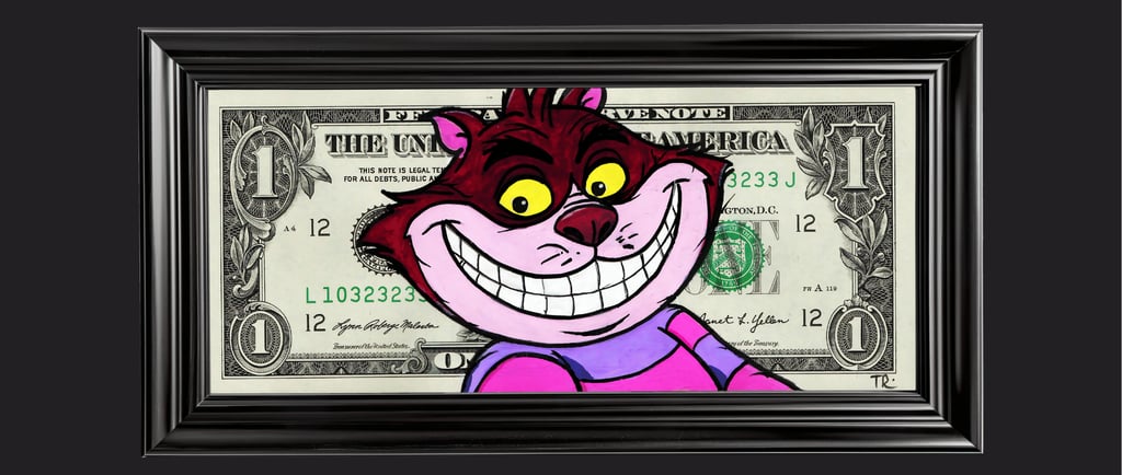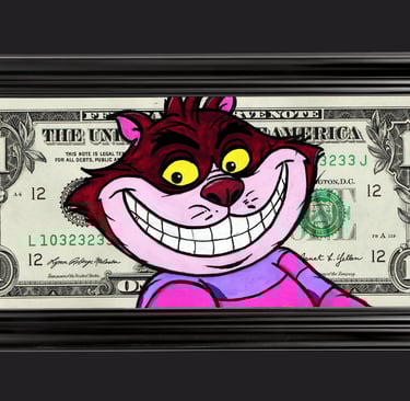 Résumé : Un billet authentique de 1 dollar est réinterprété avec le Cheshire Cat, figure mystérieuse dont le sourire démesuré mêle malice, ironie et illusion. Réalisée à la main en technique mixte (acrylique et Posca), l’œuvre transforme la monnaie en surface symbolique : ce rictus devient la métaphore d’un système affichant la prospérité tout en cachant ses paradoxes.
